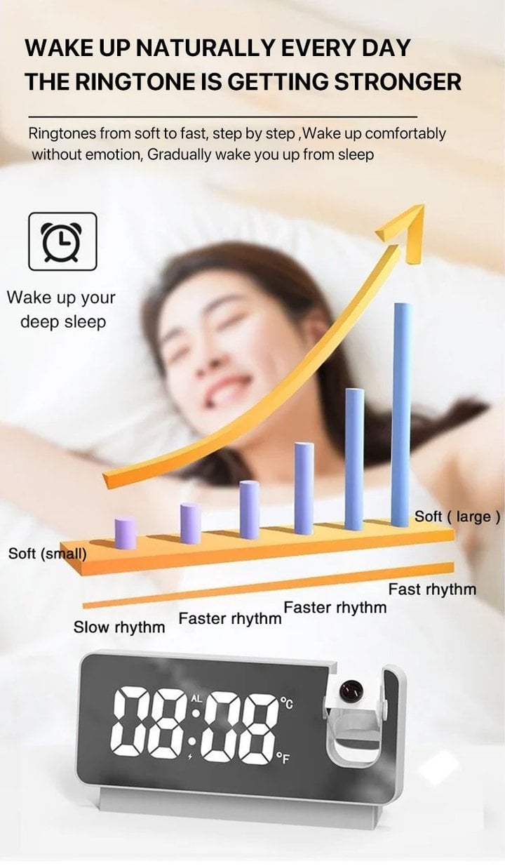 Projecteur du temps pivotant, mode nuit, double rveil avec fonction snooze, 3 types de luminosit de l'cran d'affichage, port de chargement USB, surface miroir.